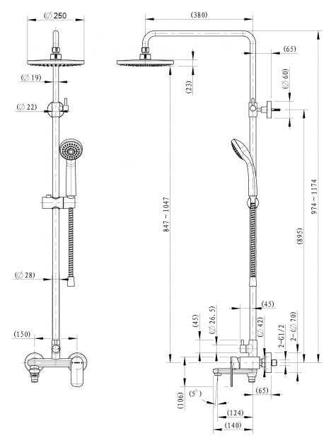 | Дополнительная информация : | высота стойки для душа: 1174 мм, диаметр душевой лейки: 110 мм, диаметр верхнего душа: 250 мм |