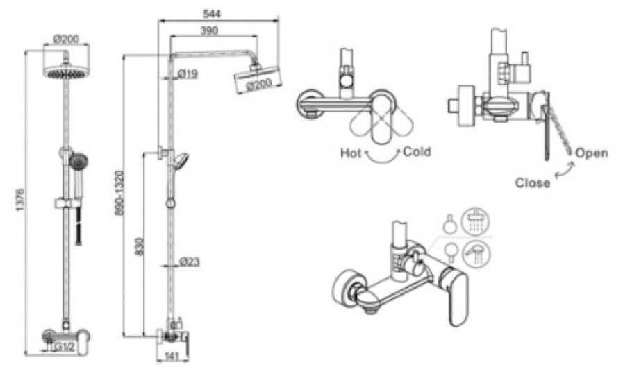 | Дополнительная информация : | высота стойки для душа: 1174 мм, диаметр душевой лейки: 80 мм, диаметр верхнего душа: 200 мм |