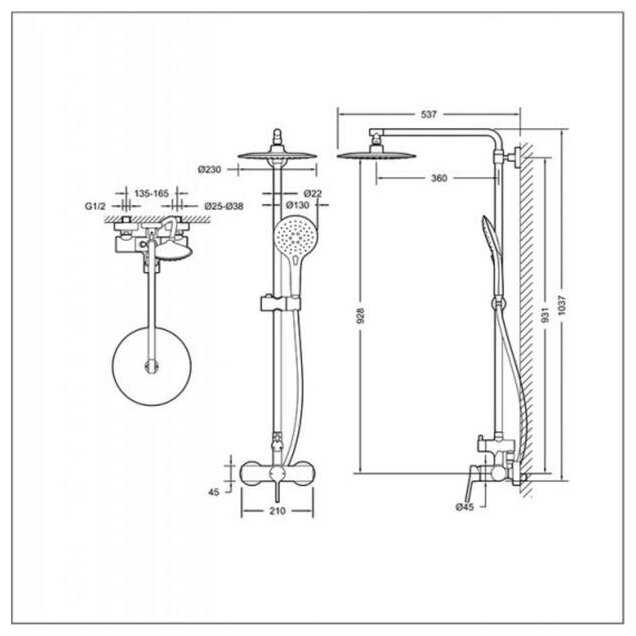 высота стойки для душа: 1037 мм, диаметр душевой лейки: 130 мм, диаметр верхнего душа: 230 мм