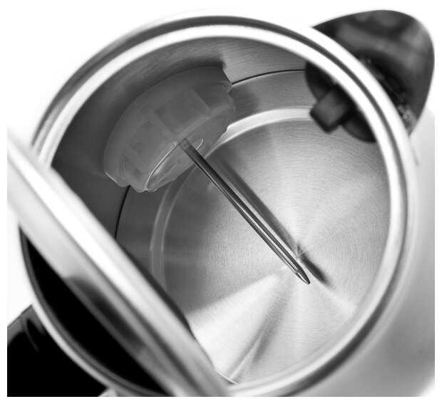 Очень хороший электрический чайник. Работает как надо, почти безшумно. Стильный, современный дизайн:чёрный с серебром. Мне нравится, что у чайника есть термометр для воды.