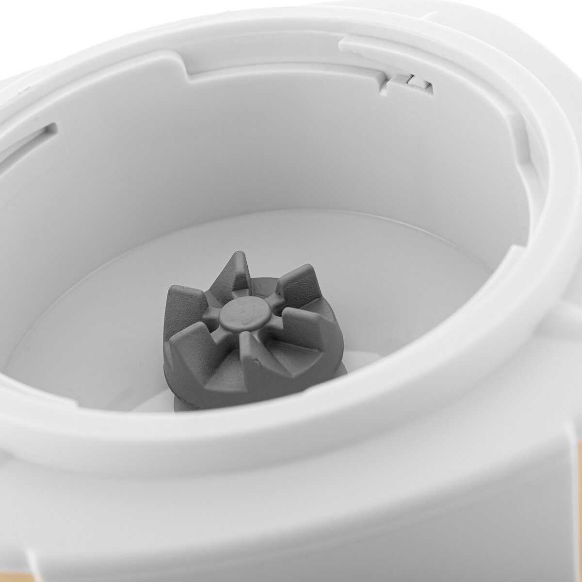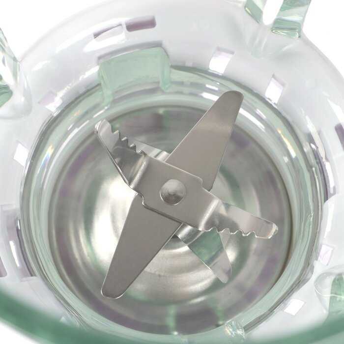 - + Стакан из крепкого толстого стекла, 6 ножей, мощность, рвёт печёнку в паштет на ура.