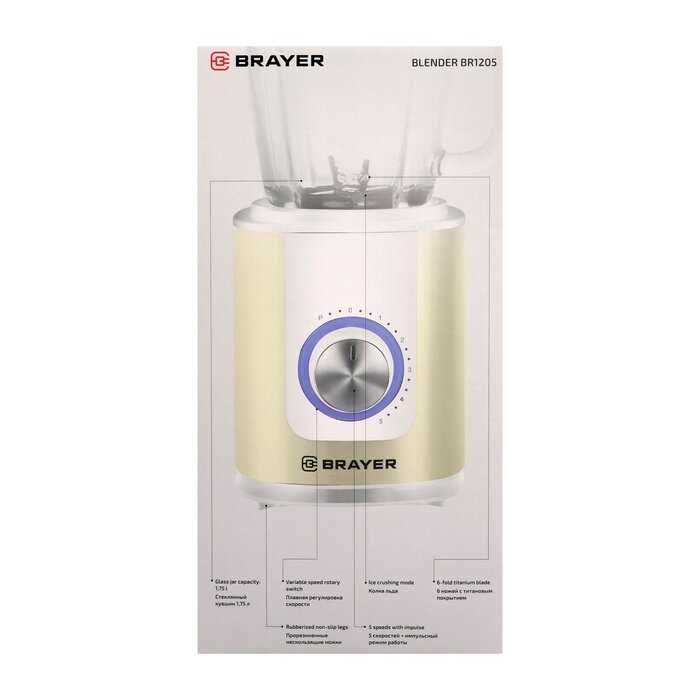 Дополнительная информация : | "Высокопроизводительный мотор 1200 Вт Плавная регулировка скорости 5 скоростей + импульсный режим работы Колка льда 6 ножей из нержавеющей стали Электронное управление Металлический корпус Стеклянный кувшин 1, 75 л Защитная блокировка Прорезиненные нескользящие ножки Электропитание 220 240 В, ~50/60 Гц" |