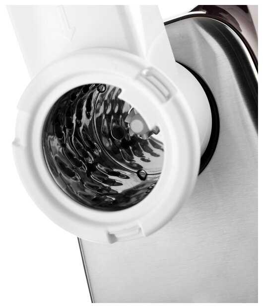Для того, чтобы пальцы не оказывались в опасной близости от вращающихся частей, есть насадки - мясная платформа, с которой кусочки можно скидывать в ородруин вращающегося лезвия и пластиковая давилка для овощей.