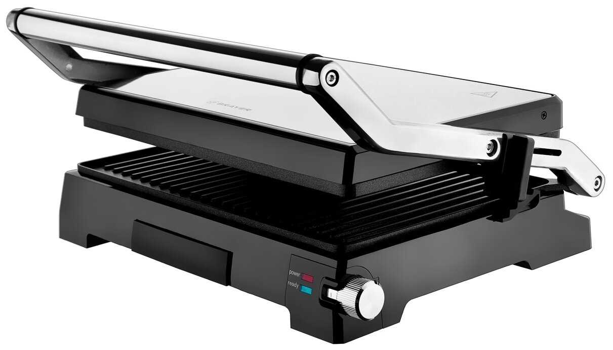 | Дополнительная информация : | пластинами размером 34×23, 5 см нагреваются до 230 °С, открытие крышки 105-180°, ручка регулятора термостата от 1 до 5, индикатор готовности и питания |