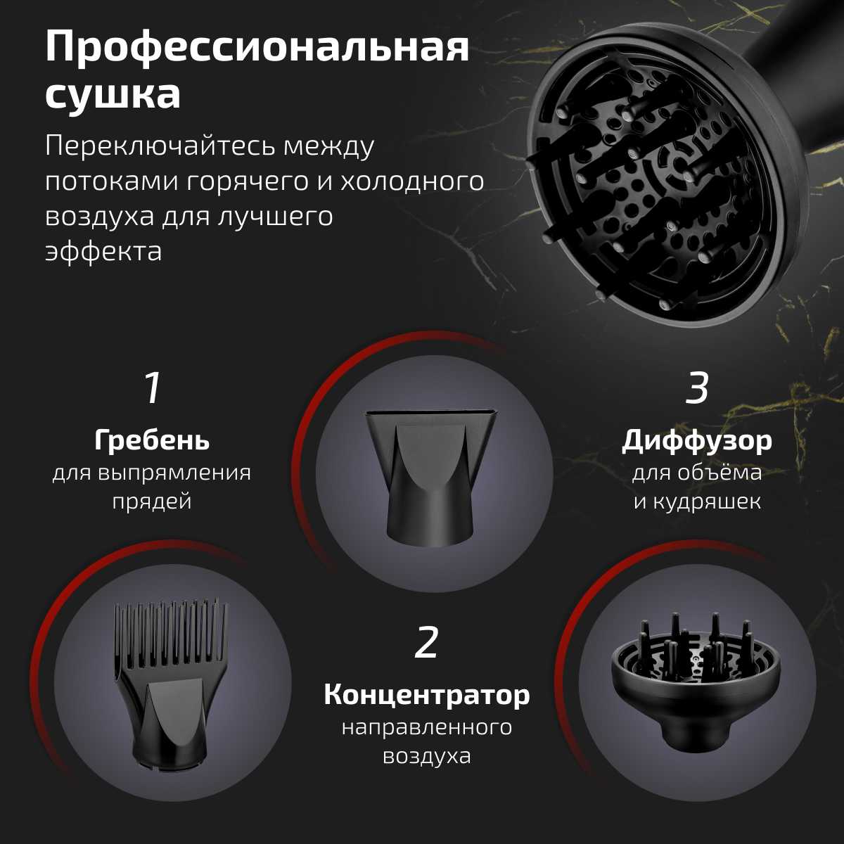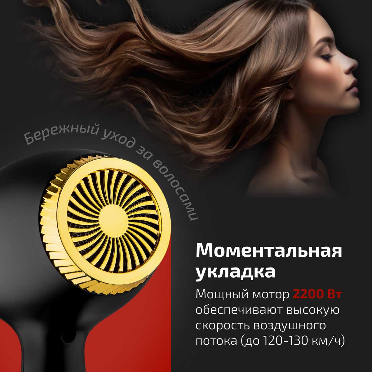 - Мощность фена: 2200 Вт