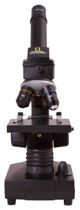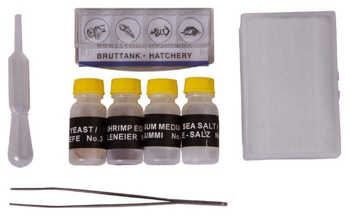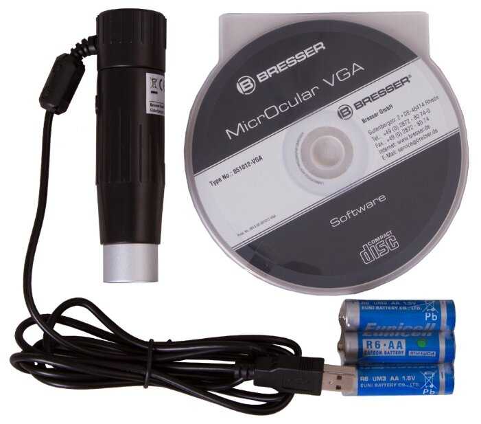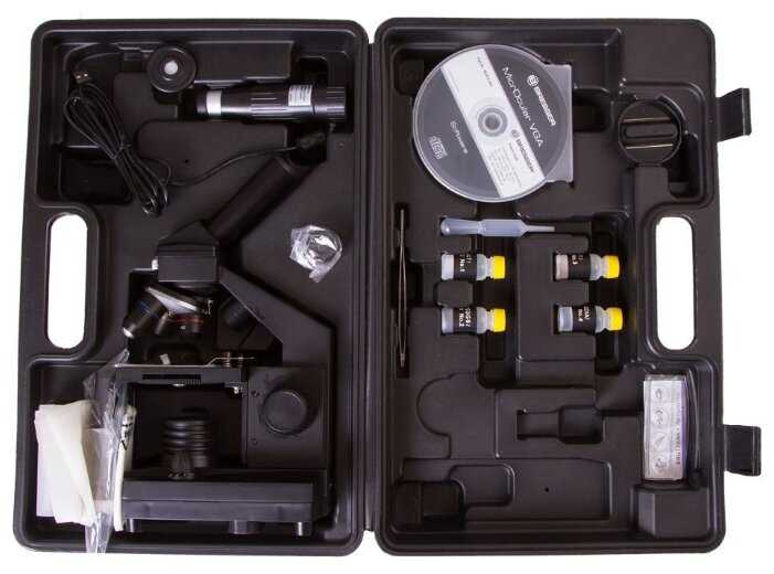Микроскоп Bresser National Geographic 40–1024x, объективы: 4х 10х 40х, окуляры: WF10х WF16х, линза Барлоу 16х, диск с цветными фильтрами, видеоокуляр (USB-окуляр), 5 микропрепаратов, 5 предметных стекол, 10 покровных стекол, коробочка для хранения стекол и микропрепаратов, пипетка, пинцет, инкубатор для разведения артемии, микротом, флаконы с препаратами: дрожжи морская соль артемия смола (для изготовления препаратов), диск с программным обеспечением, пылезащитный чехол, кейс для транспортировки и хранения, батарейки: 3 шт. типа AA, инструкция по эксплуатации.