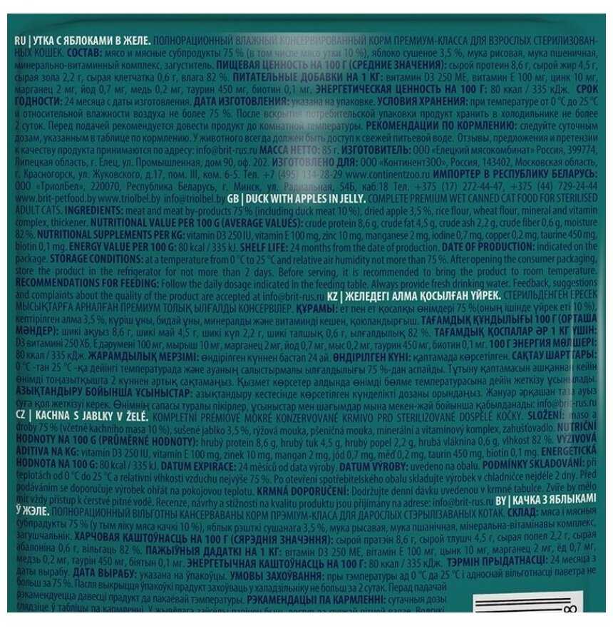 Характеристи Brit Premium [для взрослых стерилизованных кошек утка с яблоками]