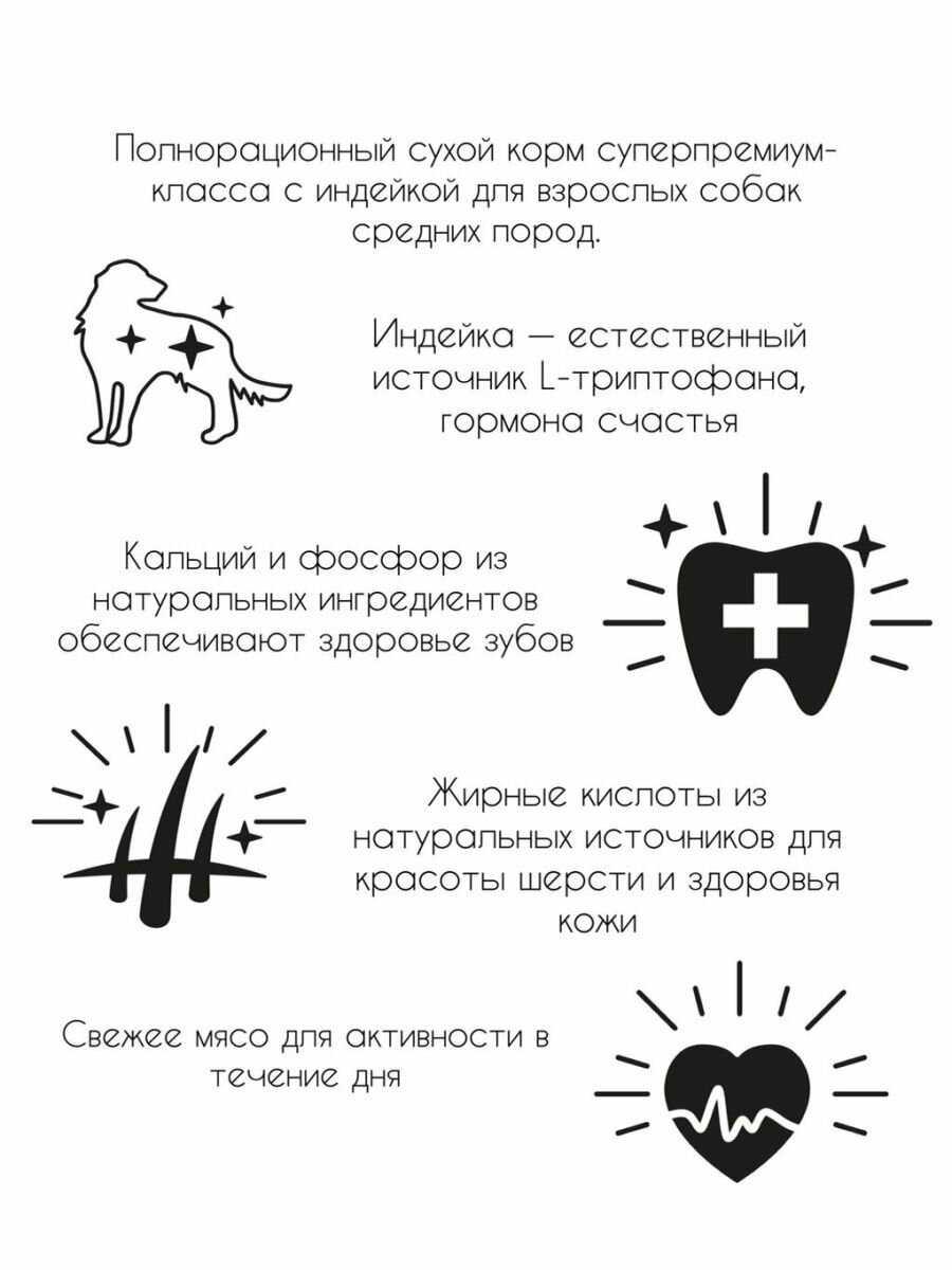 Корм оптимален для средних пород ("для средних пород подходит") с нормальной или чувствительной пищеварительной системой. Он показывает лучшие результаты у не привередливых в еде собак, склонных к аллергии на другие корма, а также у питомцев с потребностью в контроле веса. Мелким породам может не подойти из-за размера гранул.