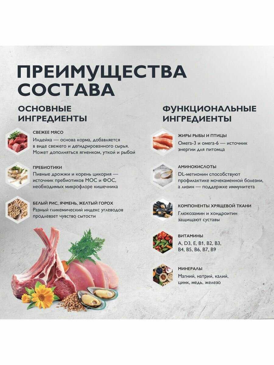 | Особые потребности : | беззерновой, гипоаллергенный, для активных животных, для беременных/кормящих, для здоровья кожи и блеска шерсти, для здоровья костей и суставов, для определенных пород, для профилактики МКБ, для снижения запаха стула, для стерилизованных/кастрированных, для ухода за ротовой полостью, при склонности к избыточному весу, при чувствительном пищеварении |