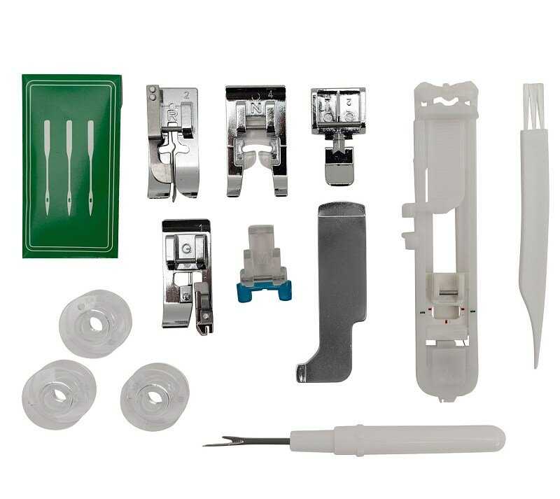 Стандартная поставка содержит универсальную лапку, лапку для молний, пришивания пуговиц, квилтинга, а также вспарыватель швов. В набор также входят 4 шпульки, иглы для разных тканей (включая трикотаж), двойная игла, дополнительный стержень для катушек и съемная рукавная платформа. Для хранения аксессуаров предусмотрен съемный пенал с прозрачной крышкой, позволяющий визуально контролировать остатки нити на шпульке. -