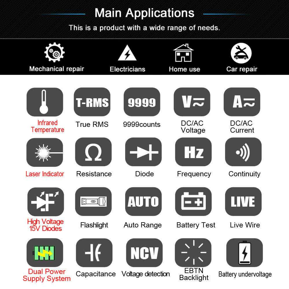 | Особенности : | автоматический выбор диапазона измерений, автоматическое выключение, защита от перегрузки, подсветка дисплея, фиксация измерений, фонарик |