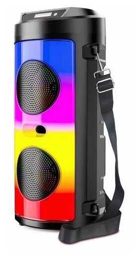 - + Классная колонка.Не хрипит.Есть разъем под флешку.Днем подсветку отключаем, а вечером светится как на дискотеке.Подключается по блютуз к любому телефону.Есть ручка за которую можно носить, а так же удобный ремешок.В комплекте шел микрофон.Пели караоке, прикольно!!!