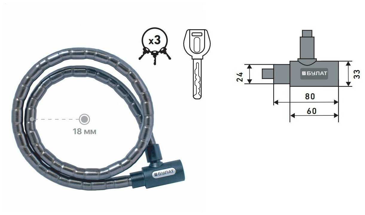- + Надежная конструкция замка, добротный ключ, плотная защита цепи.