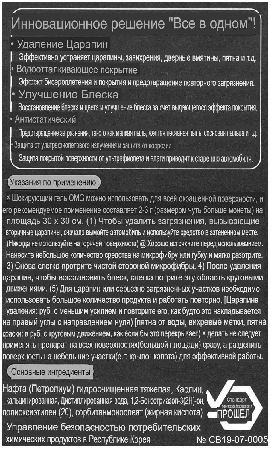 Действие : | защищает ЛКП, маскирует царапины, придает блеск, устраняет голограммы, устраняет царапины |