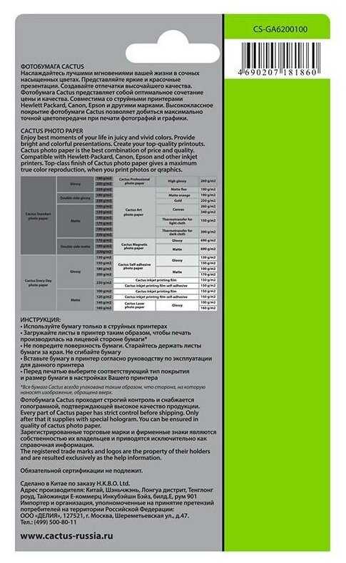 6.5/10 балловcactus GA6200100 [CS-GA6200100] [10x15] [200 г/м²]