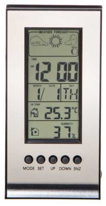 - + Отличная метеостанция, показывает все необходимые параметры: температура внутри и вне помещения, влажность воздуха. Также корректно отображает фазы луны, а анимированный прогноз погоды, часы, календарь и будильник являются удобными дополнительными функциями. При цене в 407₽ данная метеостанция - лучшая в своей категории.