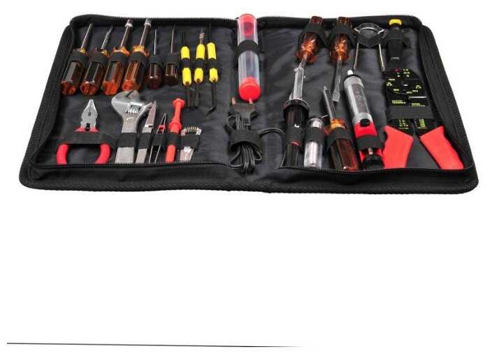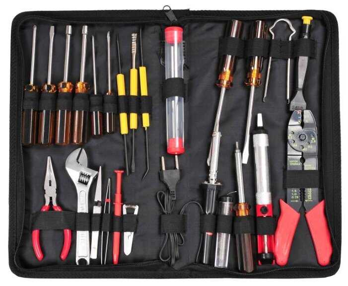 - + -Включает много полезностей для ремонта электроники и не только, пинцеты, паяльник, припой и т.д.