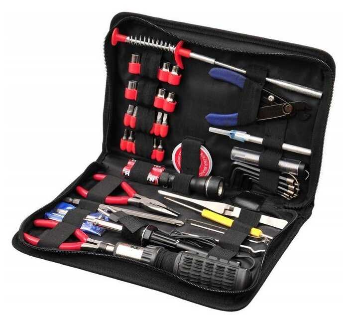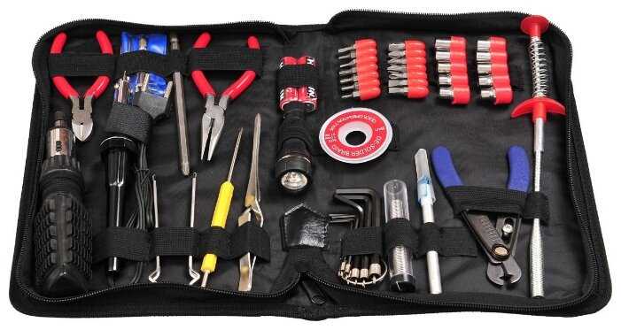 Дополнительная информация : | реверсивная рукоятка для бит, пинцет, экстрактор для микросхем, паяльник, припой, фитиль для припоя, зацеп, инструмент для разделки кабеля, скальпель, фонарик, 2 батарейки АА |