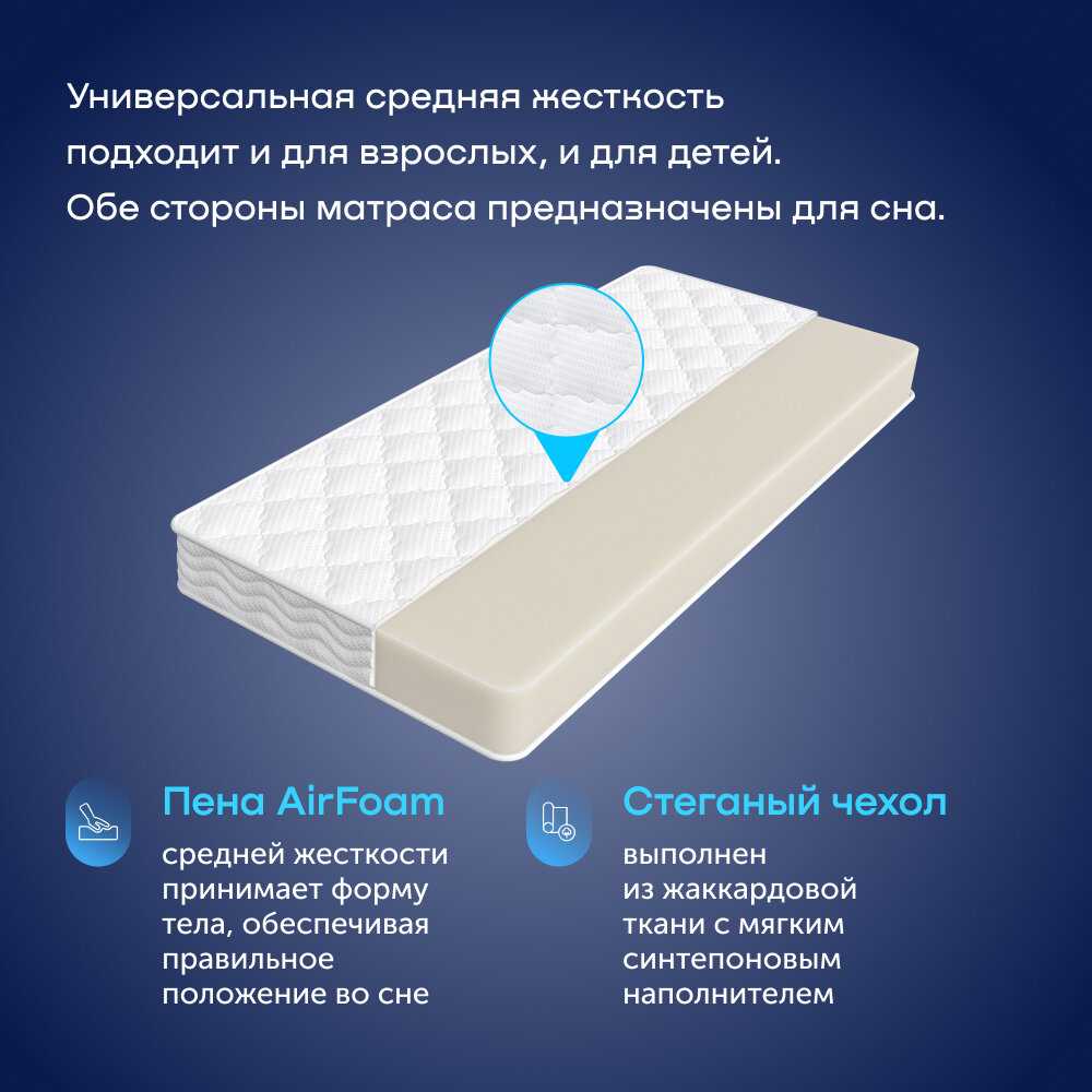Матрас является беспружинным и изготовлен из высокоплотного пенополиуретана. Внешний материал чехла обладает достаточной плотностью и приятен на ощупь. Швы выполнены качественно, что обеспечивает долговечность изделия. Нижняя часть матраса выполнена из спанбонда, который некоторые пользователи отмечают как менее плотный по сравнению с основной частью. -