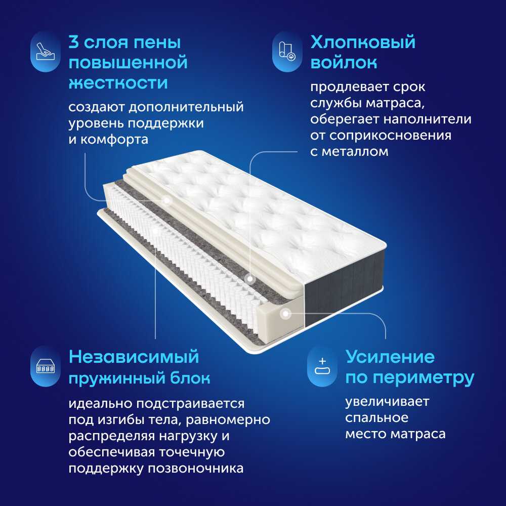 - Поверхность обеспечивает мягкое погружение при сохранении упругой поддержки позвоночника.
