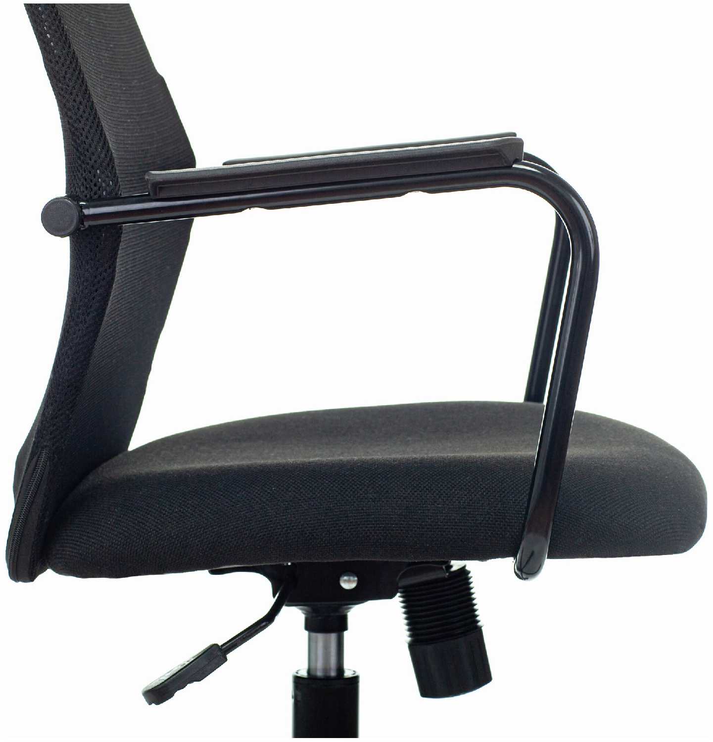 - Сетчатая спинка и тканевое сиденье пропускают воздух, спина не потеет в жару.