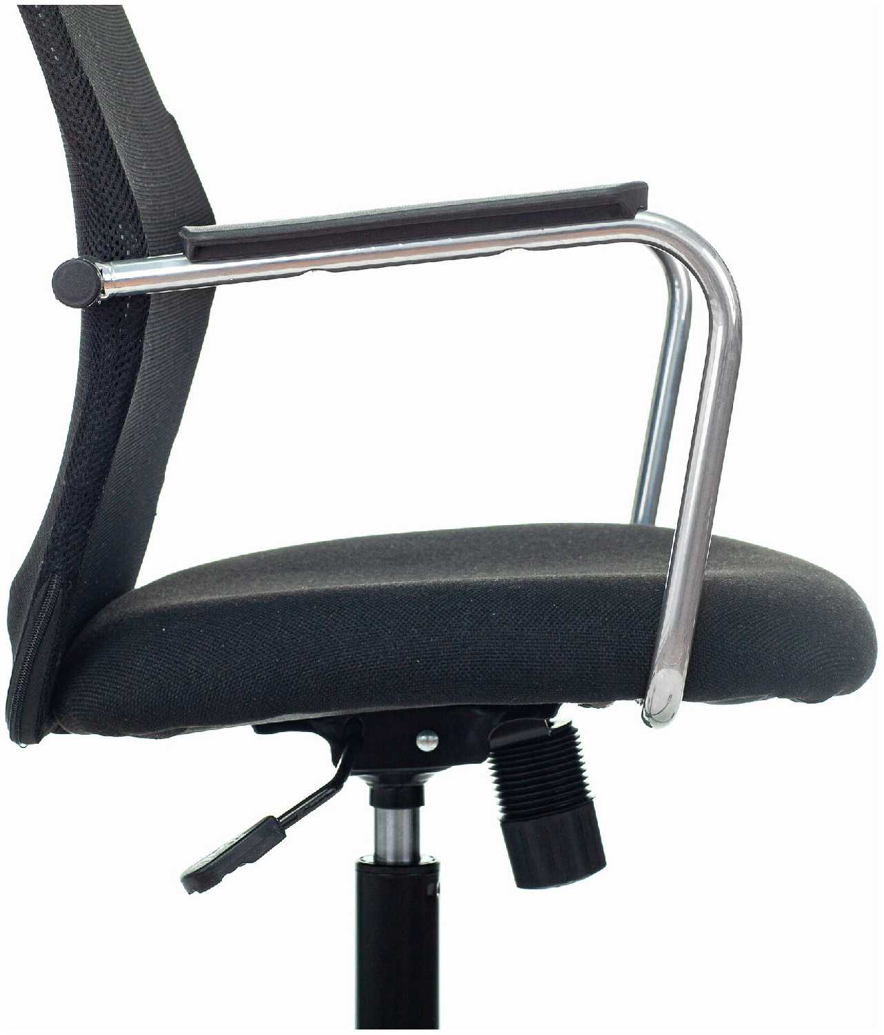 Ну если придраться))) то ткань на сидушке в мелкую сетку и в эти дырочки забивается мусор. Ну например если скушать печеньку сидя на нем, то лучше крошки не ронять на стул)))). И учтите, что подлокотники хромированные и ткань, которая одета на них не закреплена. Но это особо на эксплуатацию не влияет.