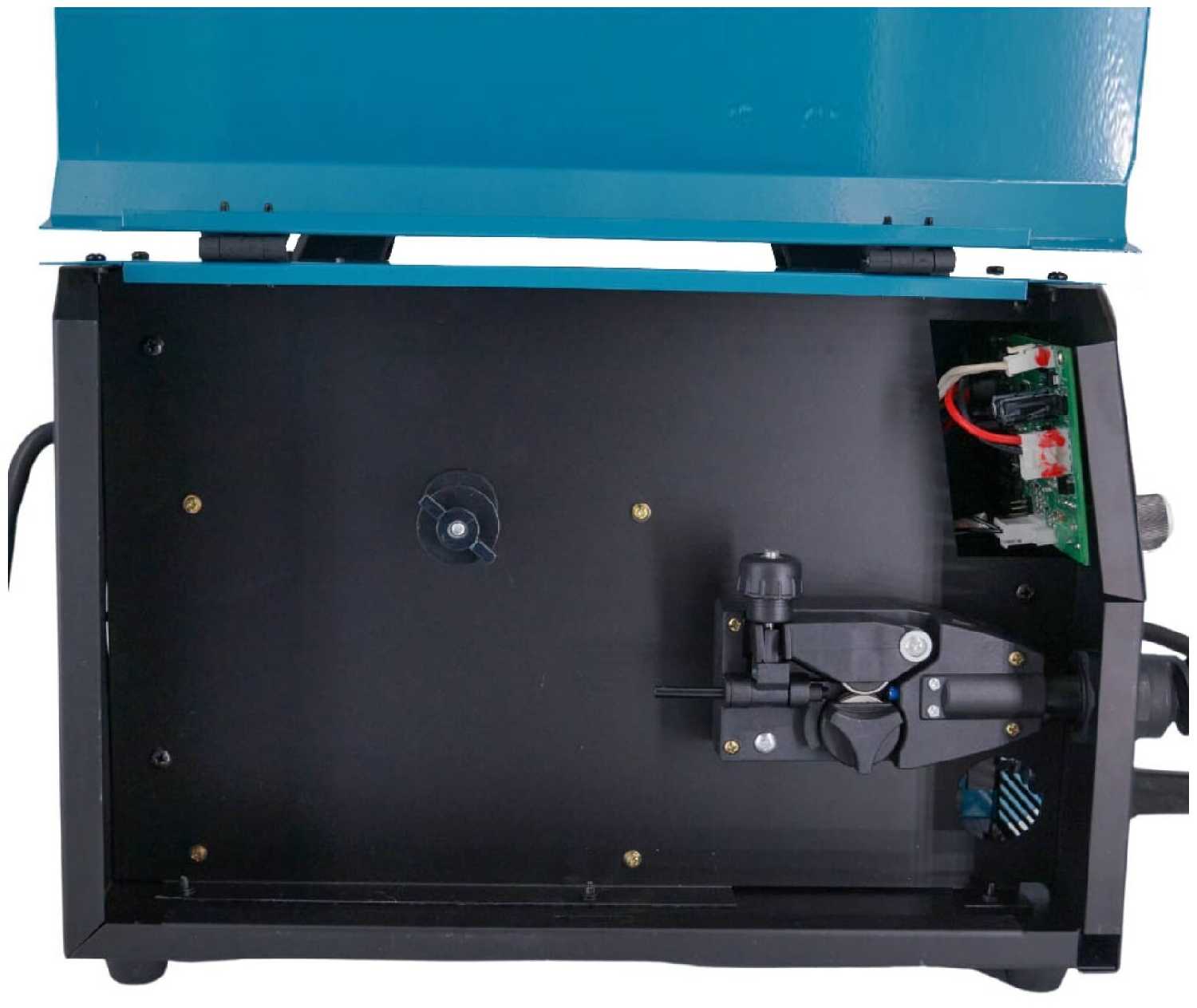 Внутреннее пространство аппарата позволяет установить катушку с проволокой массой не более 1-2 кг. Стандартная килограммовая катушка входит без проблем. Это следует учитывать при планировании продолжительных работ, чтобы иметь запас проволоки или быть готовым к ее замене. -