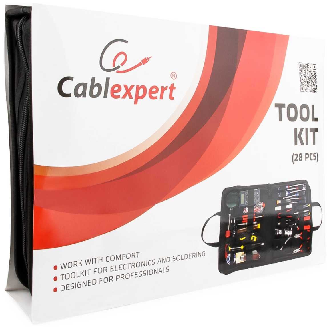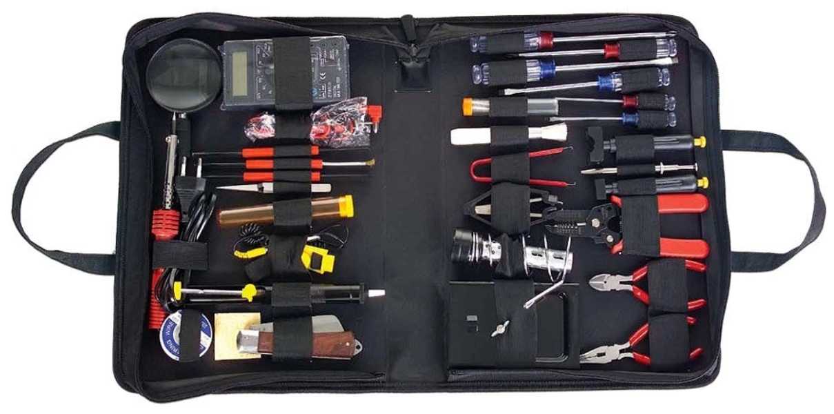 Инструменты в комплекте : | клещи, клещи для снятия изоляции, кусачки, отвёртки, отвёртки для точных работ, пассатижи, паяльник, плоскогубцы |