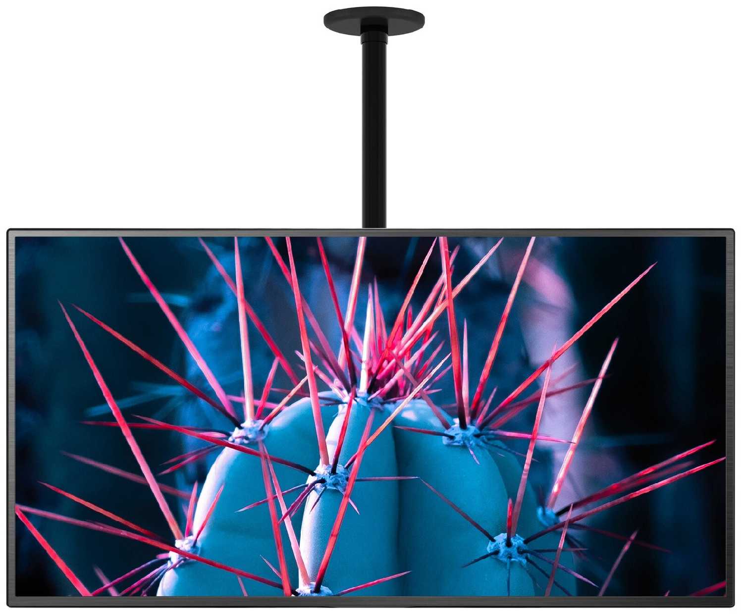 Сомневался между настенным и потолочным кронштейном и в итоге остановился на потолочном. Повесили телевизор прямо в углу комнаты, что с настенным не вышло бы. Конструкция небольшая, но прочная, в черном цвете. Основание под размер Vesa 700x400, надежно держит телевизор с диагональю 65 дюймов.