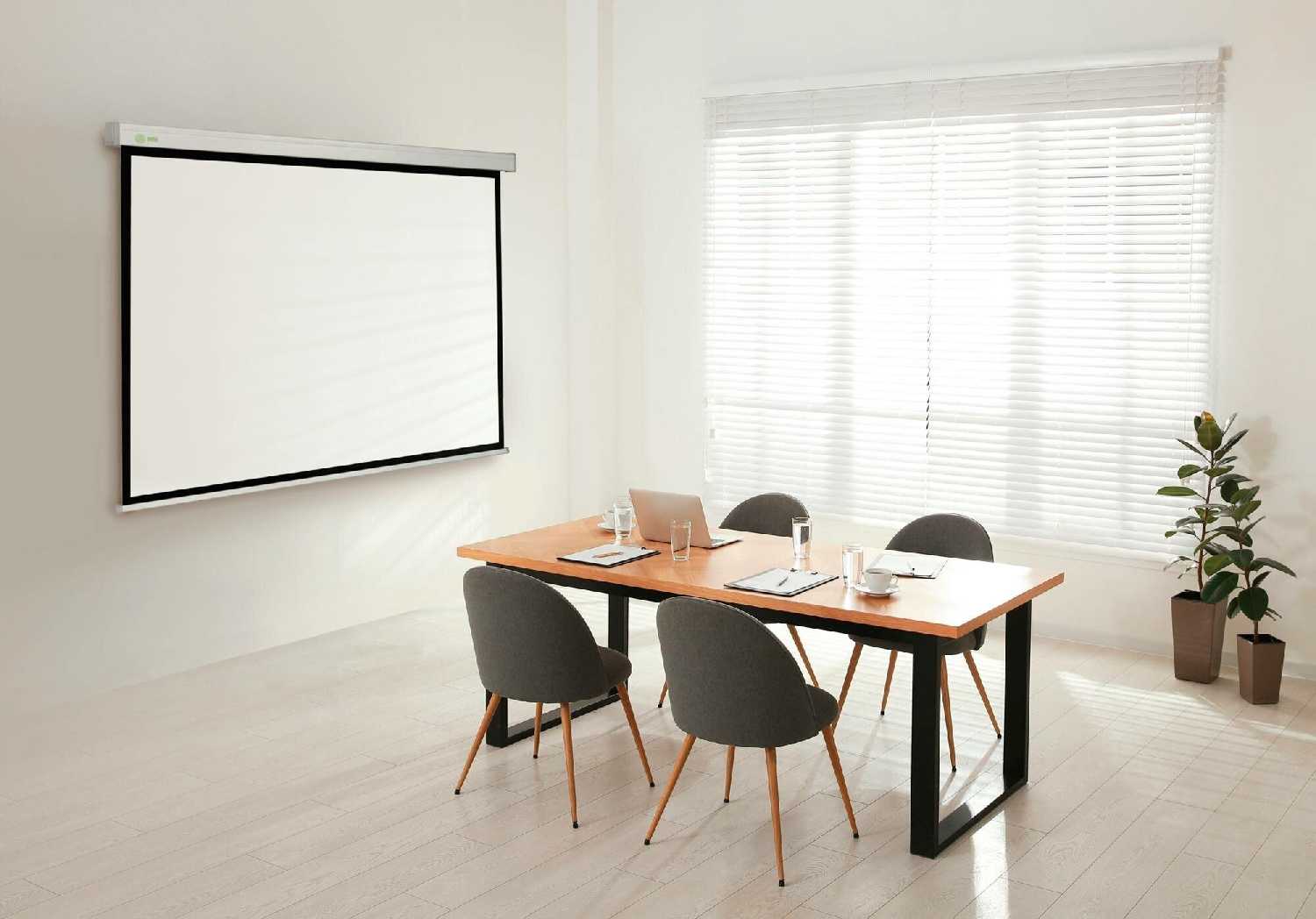 - В свернутом состоянии экран представляет собой аккуратный короб, который не загромождает пространство и эстетично выглядит.