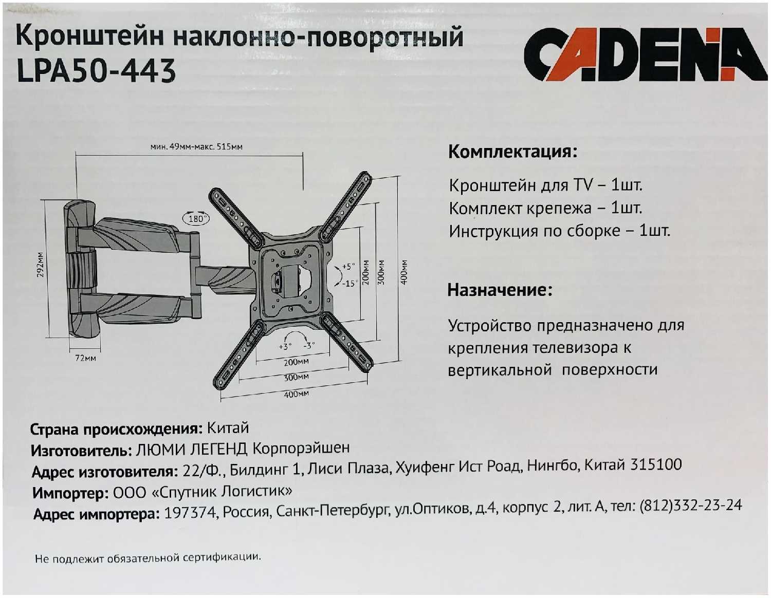 Отзывы о Кронштейн CADENA Кронштейн наклонно-поворотный (LPA50-443)