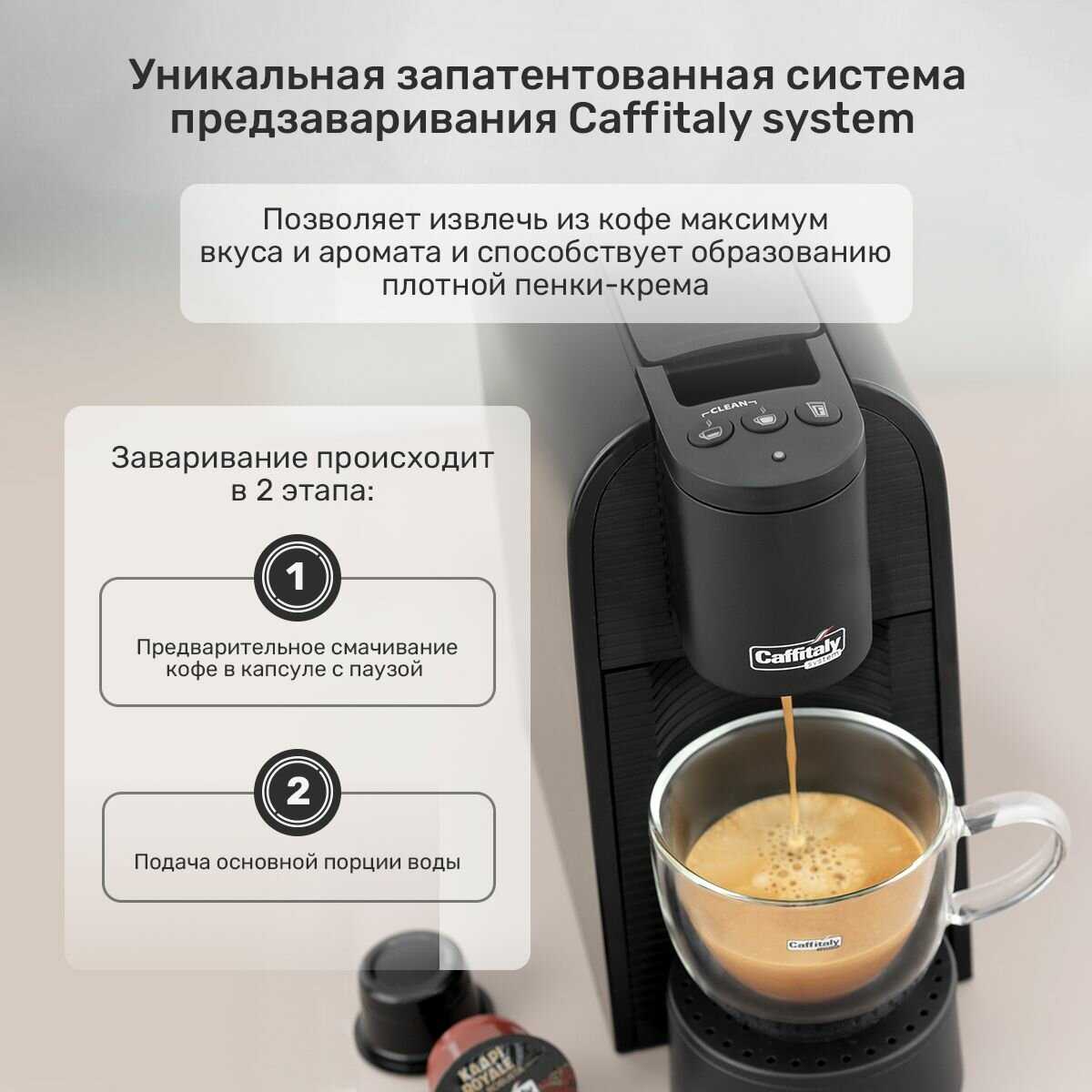Машина поддерживает все виды напитков, доступные в капсулах Caffitaly system: эспрессо, лунго, ристретто, а также капучино при наличии капучинатора. Качество кофе остается стабильным благодаря точному контролю температуры воды (90-95°C) и давлению (15 бар). -