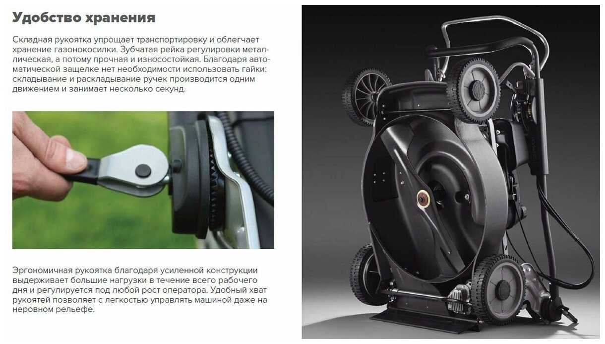 - - Не самое удобное крепление травосборника, но надежное. Тяжёлая для ручного переноса, так же для него отсутствует ручка.