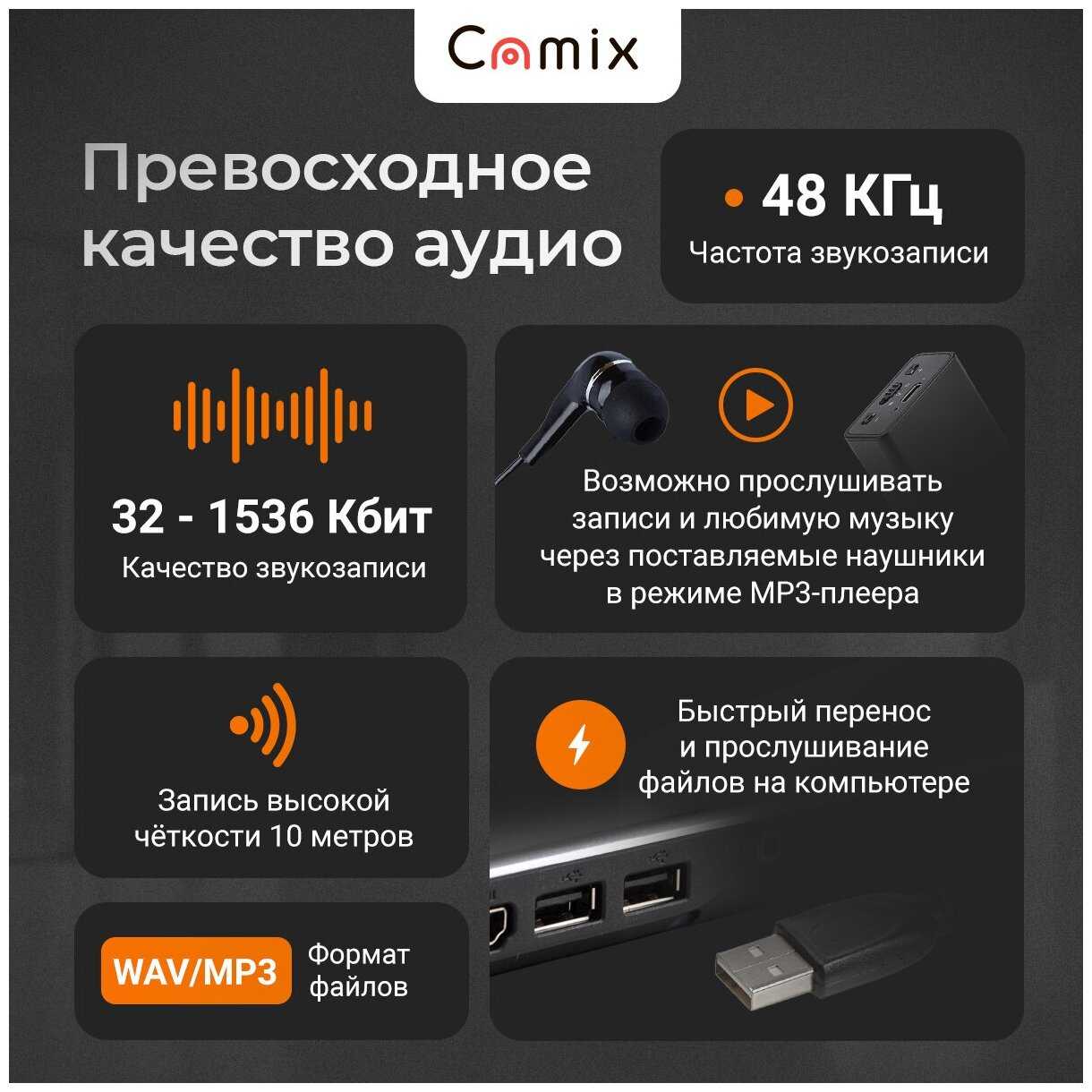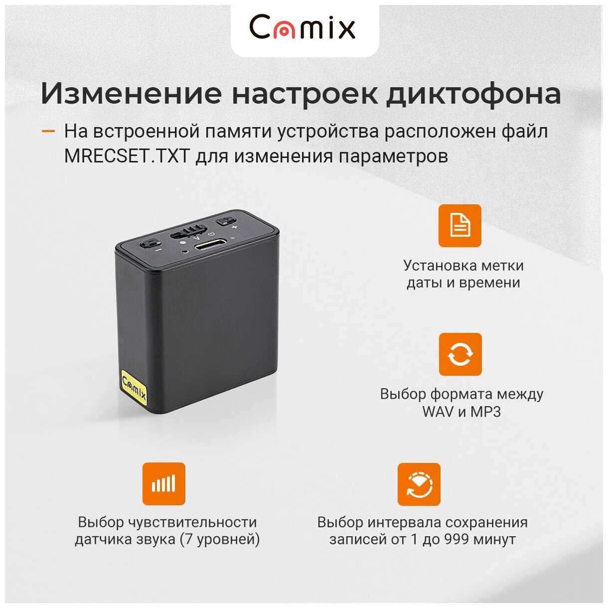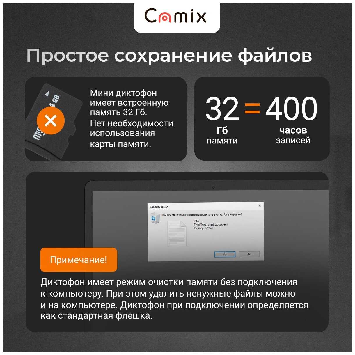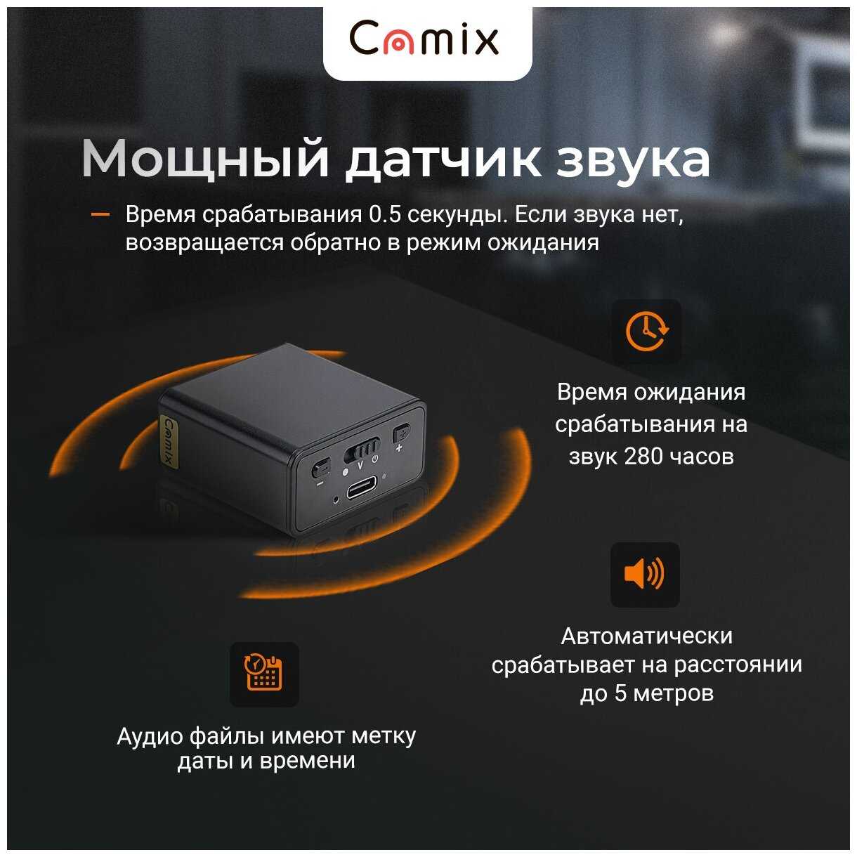 - Автоматически включается при обнаружении звука, экономя заряд и предотвращая пустые записи.
