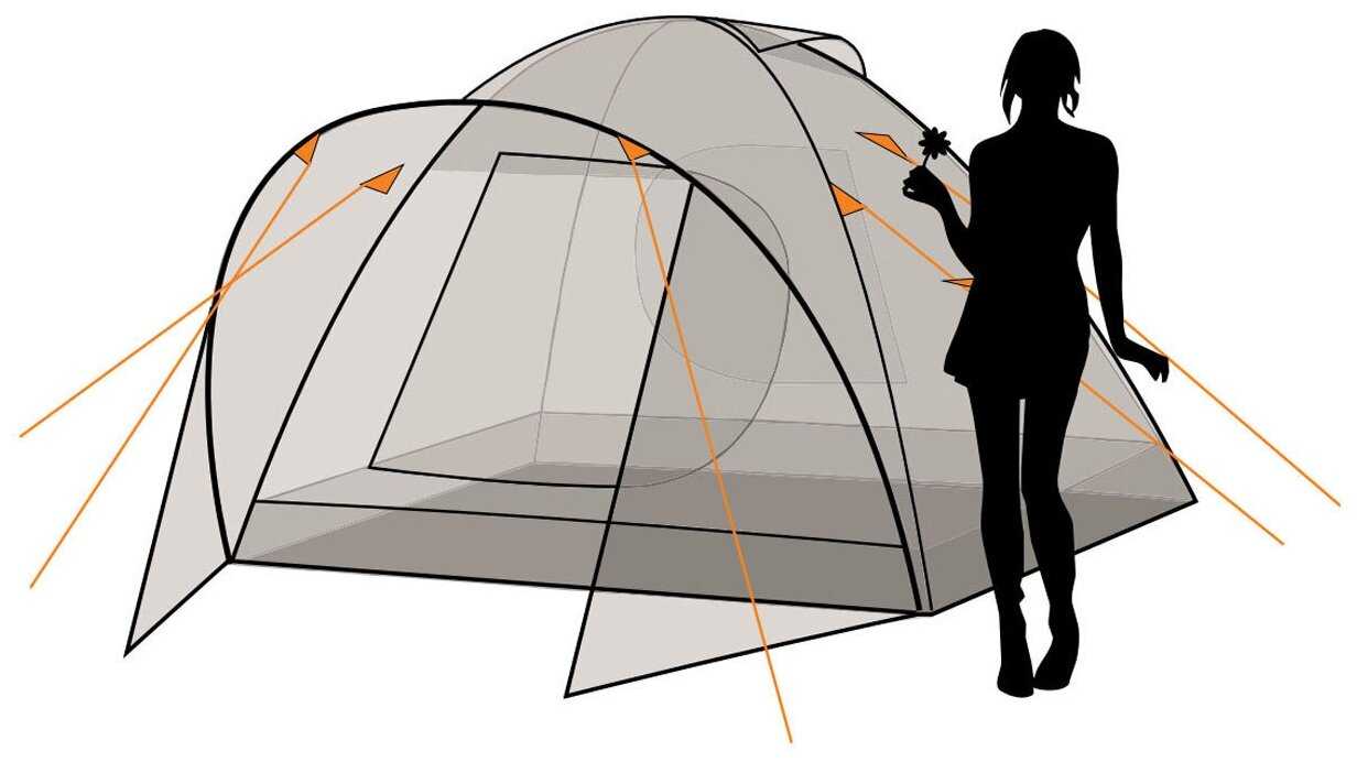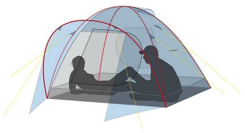 1 комната, УФ-защита, вентиляционные отверстия, внутренние карманы, внутренняя палатка, огнеупорная пропитка, окна, проклеенные швы, тент