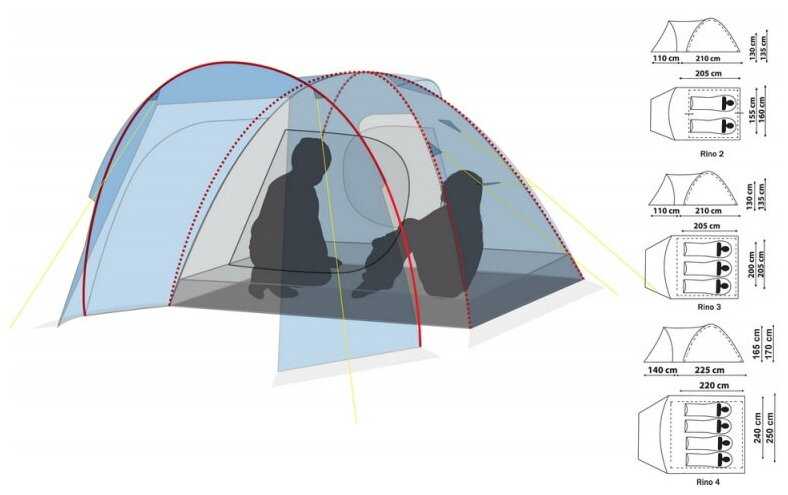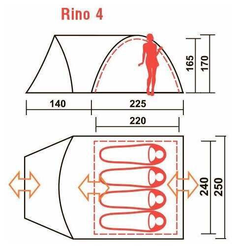диаметр дуг: 9.5 мм, длина внутренней палатки: 225 см, ширина внутренней палатки: 240 см, высота внутренней палатки: 165 см