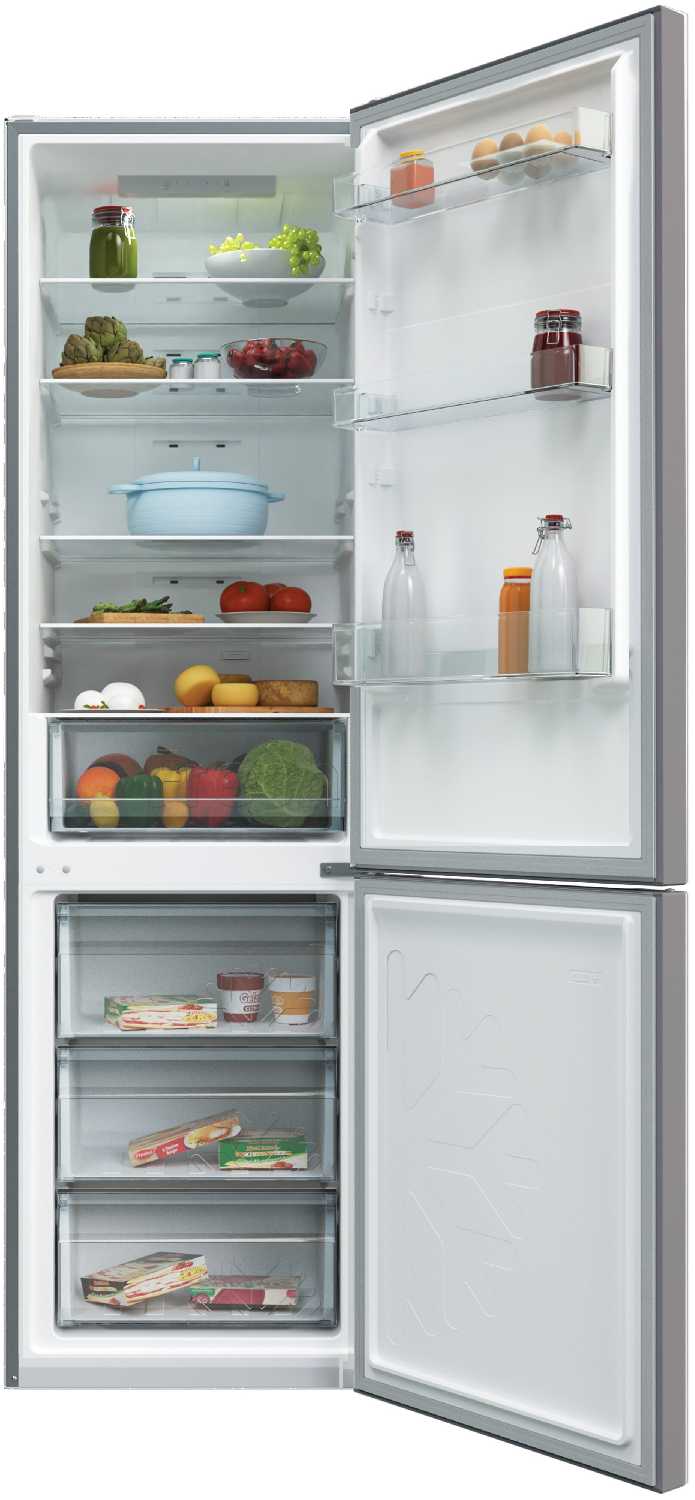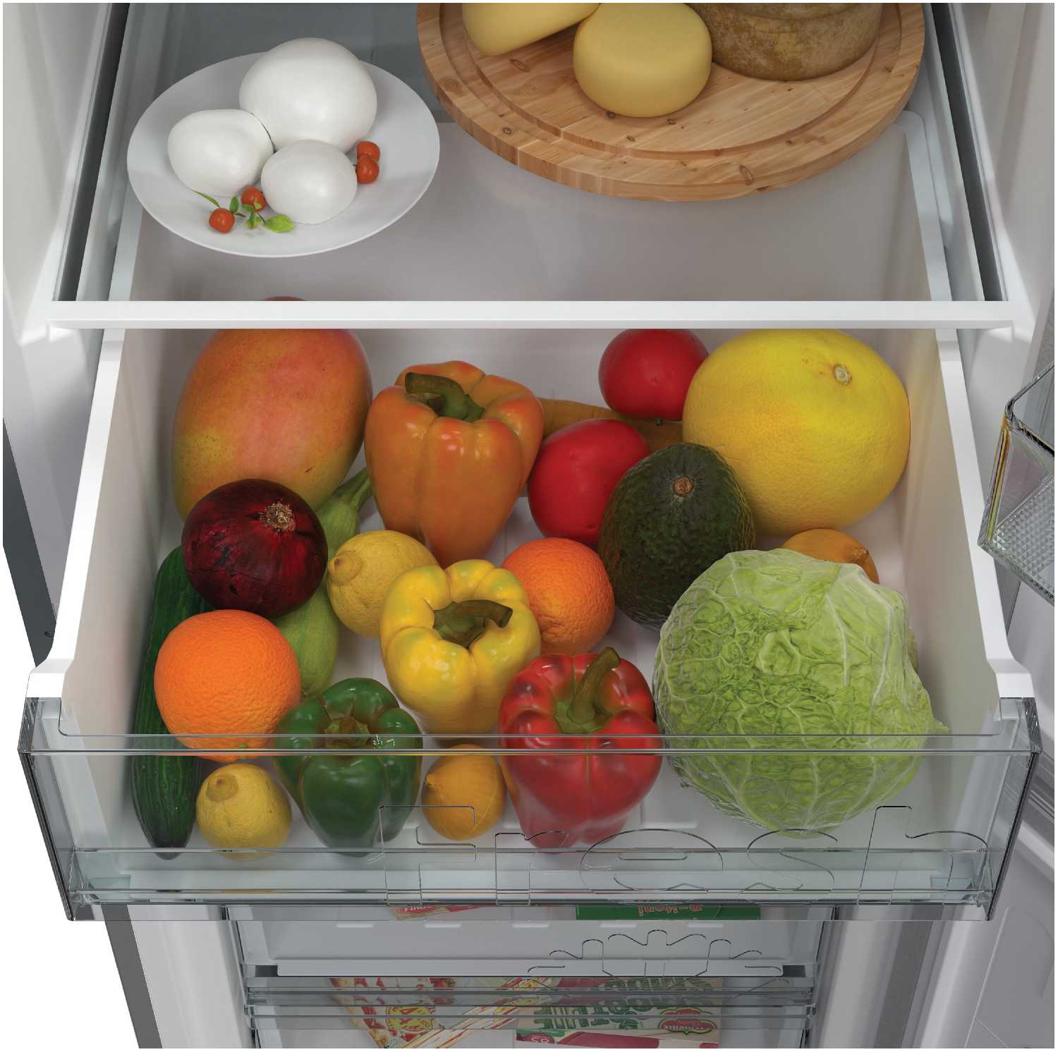 - Большой выдвижной ящик для овощей и фруктов (зона свежести) с поддержкой влажности.