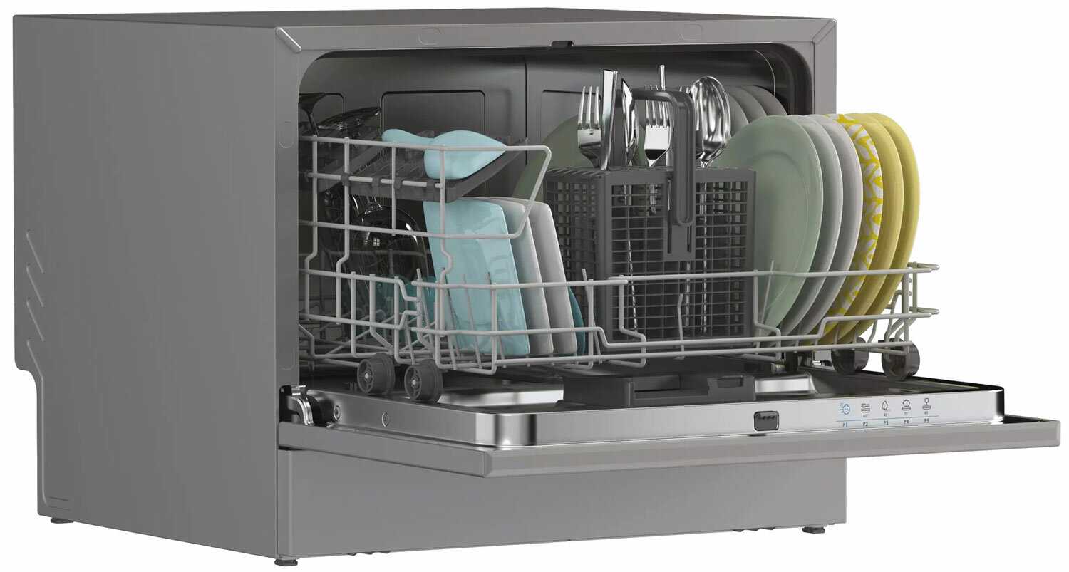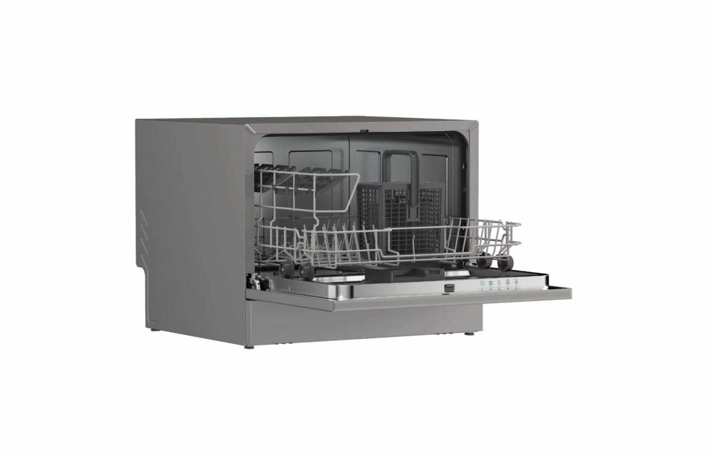 Машина имеет компактные внешние габариты, примерно вдвое меньше полноразмерной модели. Ее можно свободно разместить на столешнице кухонного гарнитура, не занимая место в шкафу, что особенно удобно для съемного жилья или малогабаритных кухонь. Установка не требует сложного встраивания, многие пользователи подключают ее самостоятельно. Устойчивость конструкции обеспечивает надежную работу без сдвигов во время циклов мойки. -