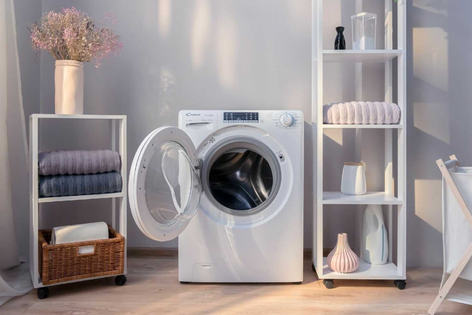 - При отжиме на 800–1000 оборотов вибрации минимальны благодаря системе балансировки: флаконы на панели не двигаются, машинка не «скачет».