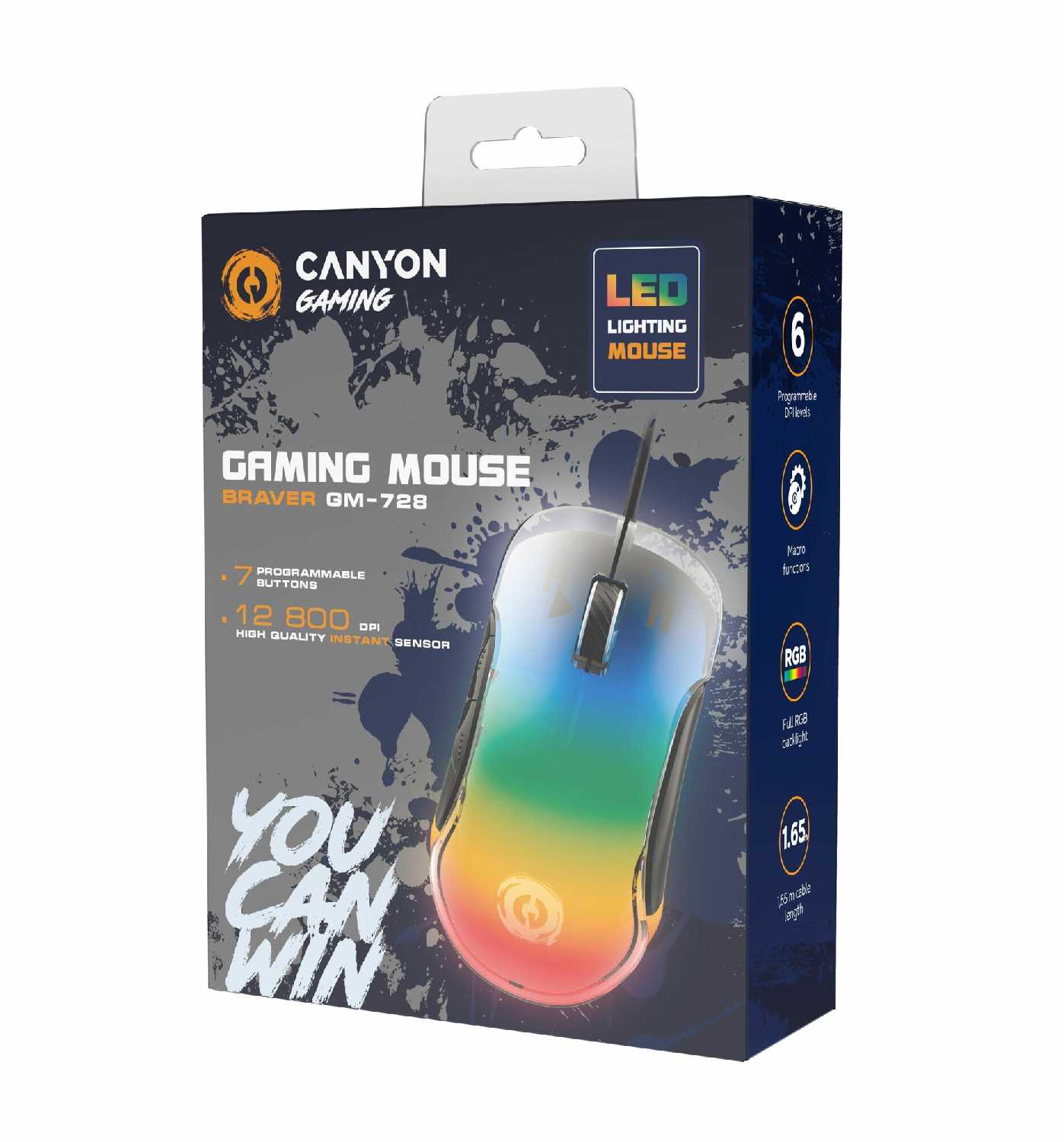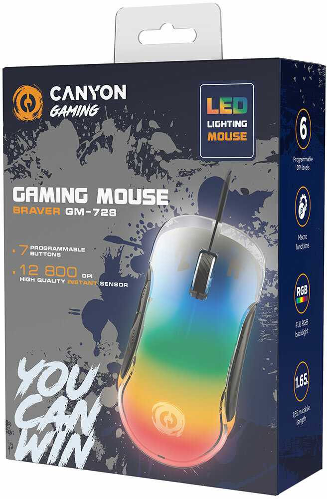 | Комплектация : | Мышь компьютерная Canyon Crystal GM-728 1.65м/7кн/Черный (CND-SGM728) |