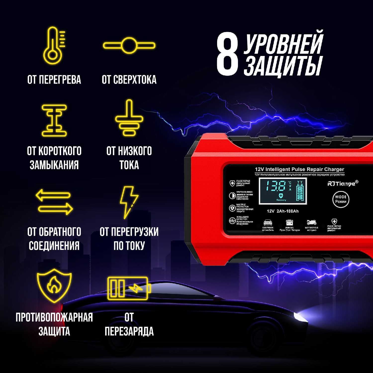 - Поддержка аккумуляторов с напряжением от 6В (мототехника) до 12В (авто).