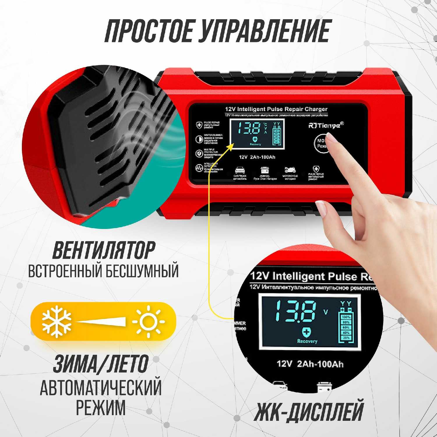 | Функции : | автоматическое отключение зарядки, встроенный амперметр, встроенный вольтметр, встроенный фонарь, подходит для AGM/GEL аккумуляторов, режим зимней зарядки, тест состояния АКБ |