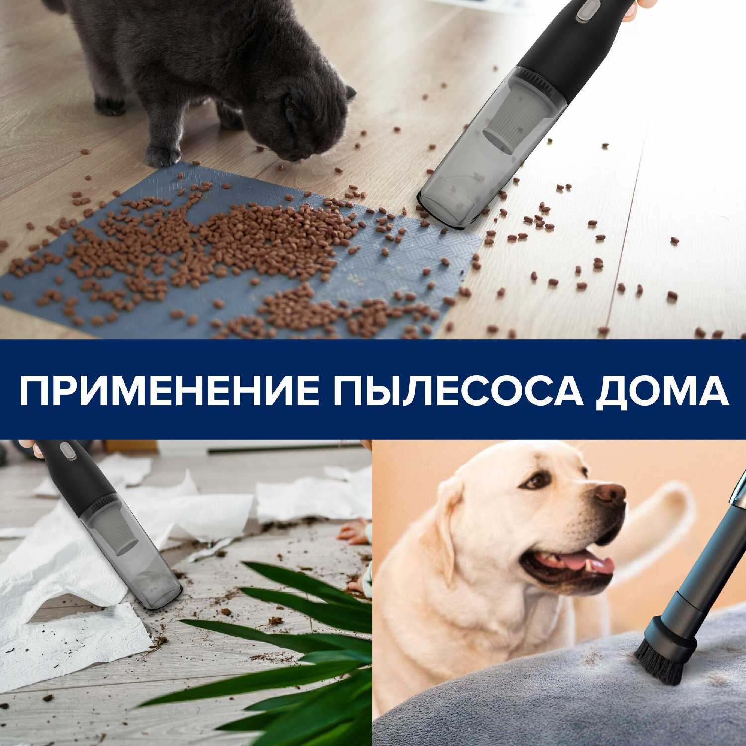 - Справляется с уборкой мелкой пыли и шерсти животных в салоне автомобиля и труднодоступных местах домашней мебели.