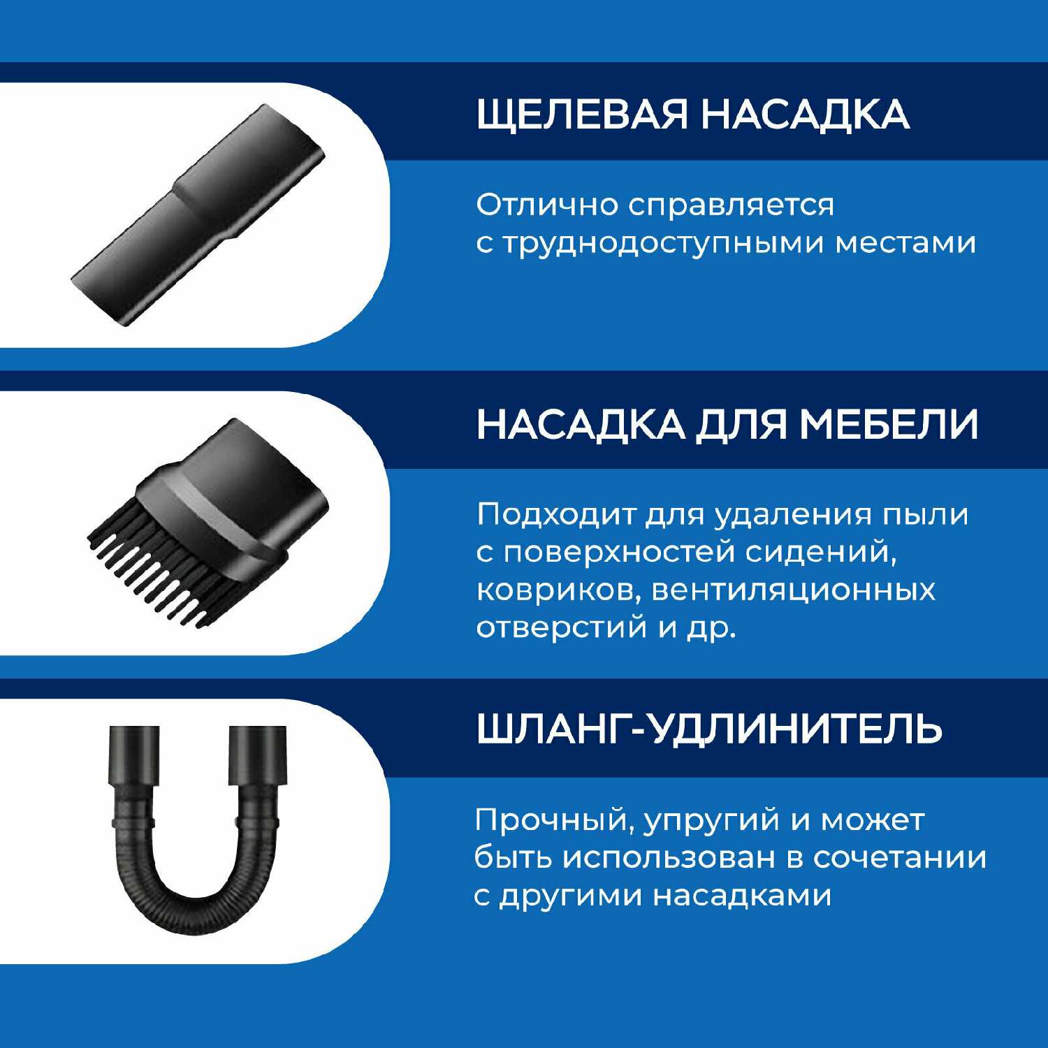 В комплекте присутствуют все основные насадки, необходимые для уборки в салоне автомобиля: стандартная щелевая и, судя по отзывам, щетка для обивки. Пользователи находят их достаточными для эффективной очистки сидений, ковриков и труднодоступных уголков. Однако есть замечание, что крепление некоторых насадок может быть недостаточно надежным. -