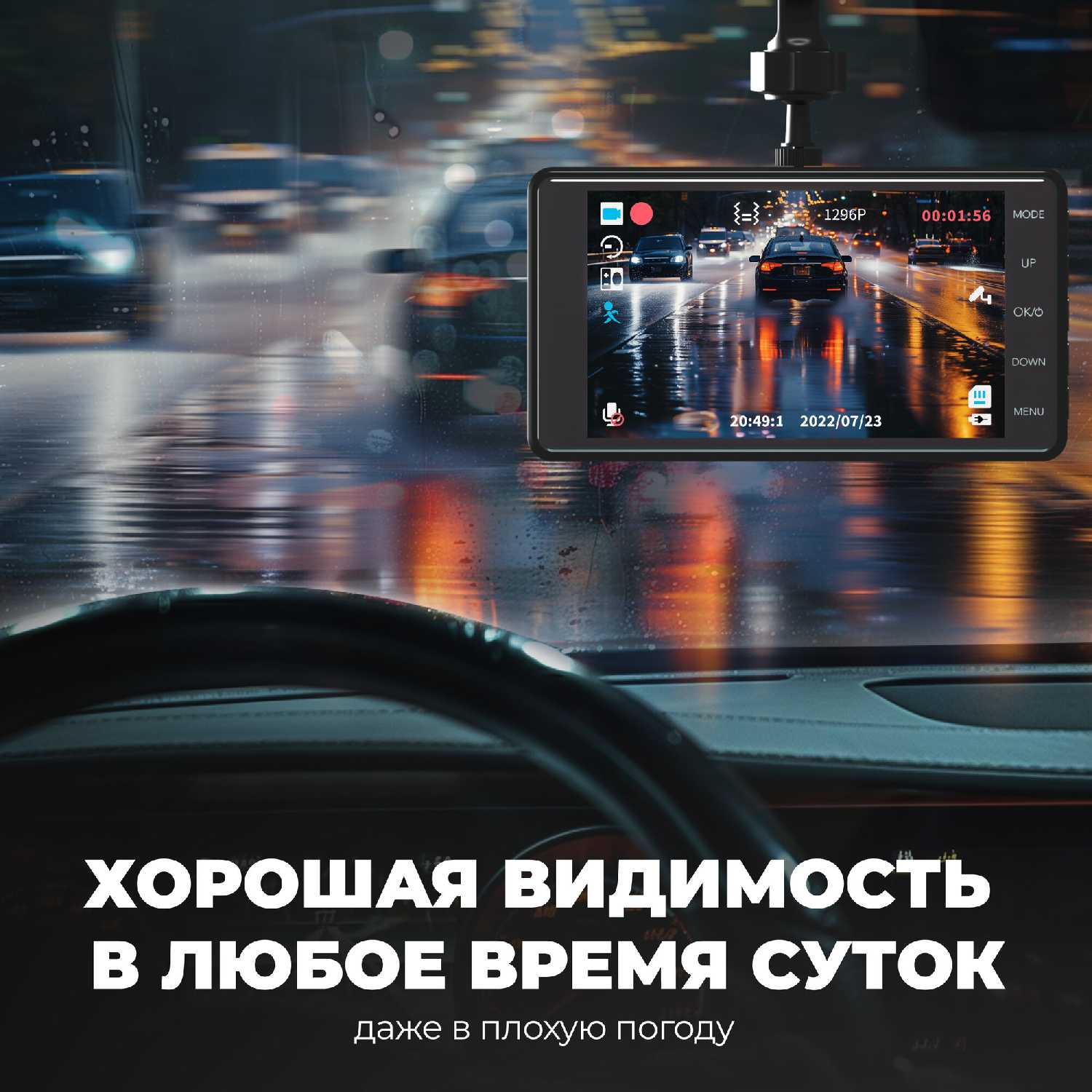 - Задняя камера в комплекте позволяет документировать события сзади автомобиля, значительно повышая общую безопасность и доказательную базу.
