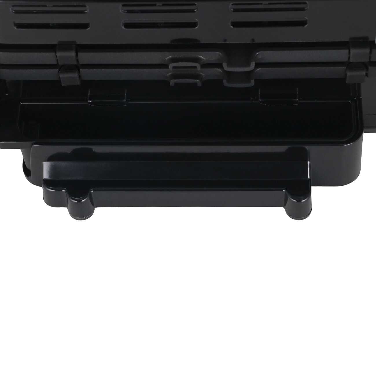 | Особенности : | антипригарное покрытие, поддон для сбора жира, регулировка высоты верхней панели, решетка, съемные пластины |