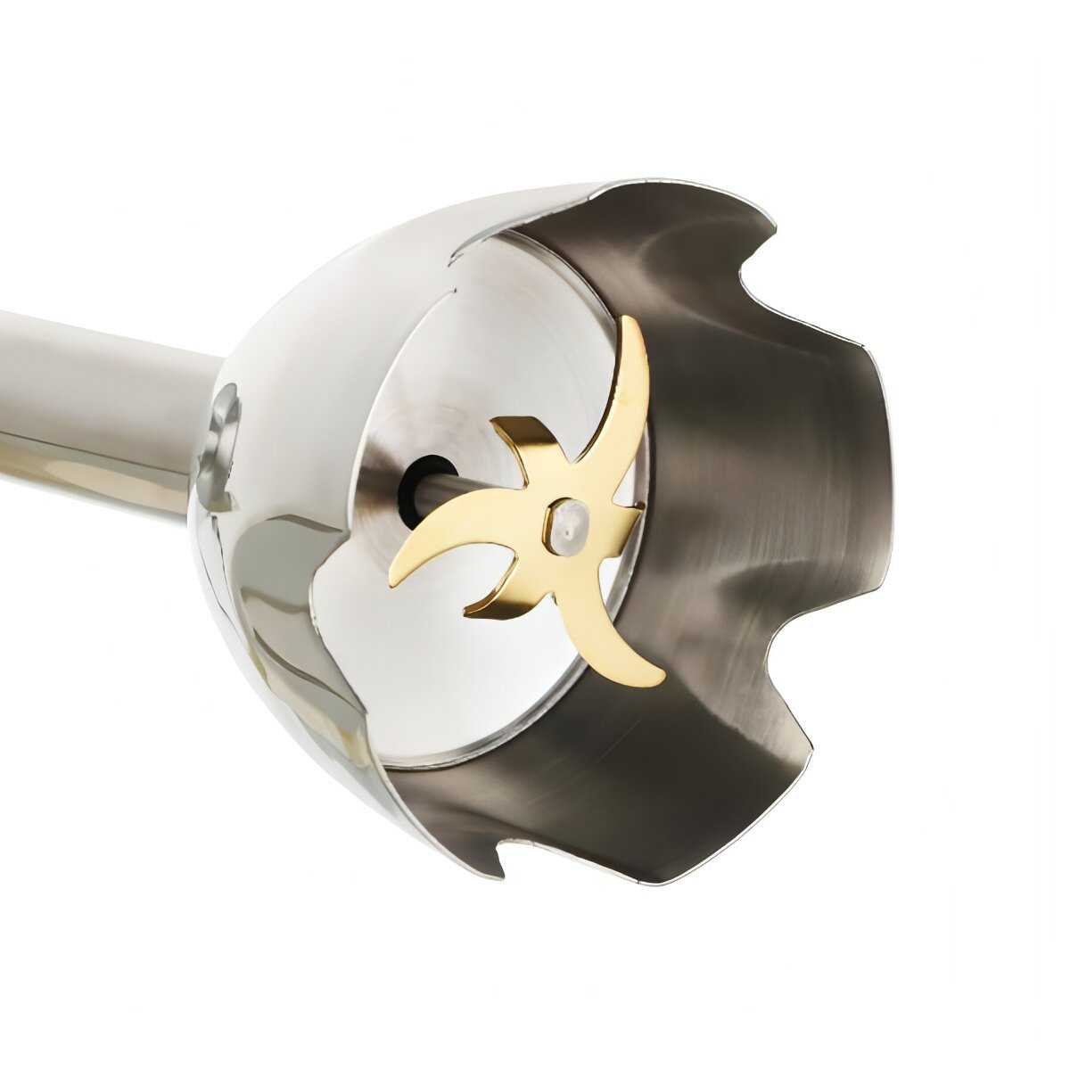 В стандартную комплектацию входят три основные насадки: погружной блендер, венчик для взбивания и измельчитель. Погружная насадка оснащена шестилепестковым ножом, что обеспечивает более быстрое и качественное измельчение по сравнению с обычными двухлепестковыми моделями. Венчик идеально подходит для взбивания белков для безе или кремов, а измельчитель справляется с твердыми продуктами, орехами и зеленью. -