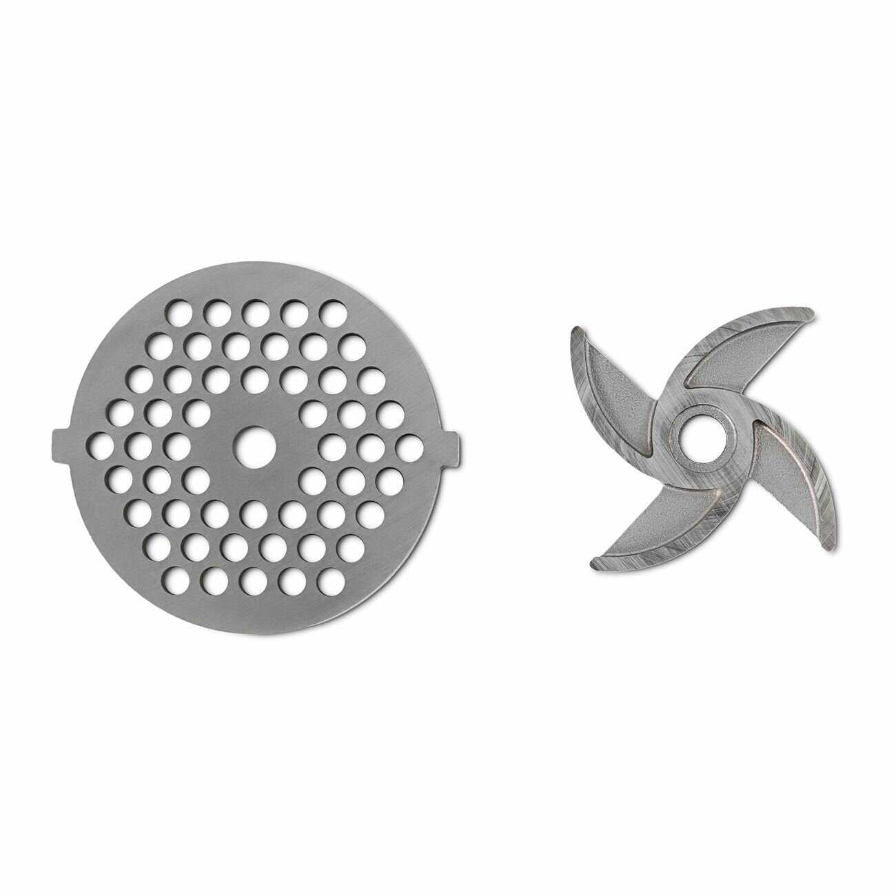 Базовая комплектация часто включает две решетки из нержавеющей стали с разным диаметром отверстий для фарша разной степени помола. Некоторые комплекты дополнены насадками для приготовления колбасок и кеббе, что высоко оценивается пользователями, предпочитающими домашние полуфабрикаты. -