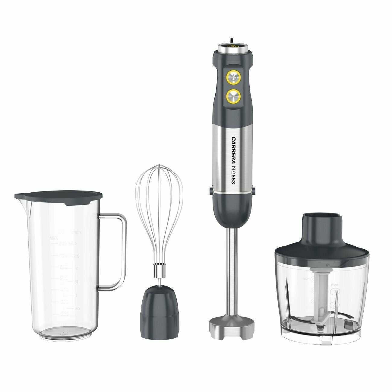 - + Блендер Carrera CRR553 3 в 1 с прочным стальным корпусом, острым 4-лепестковым ножом и полностью металлической ногой позволяет приготовить смузи и пюре из овощей и фруктов, взбить воздушные молочные коктейли, приготовить домашний майонез, детское питание и многое другое. Шесть скоростей дают возможность адаптировать блендер под любой продукт, при этом можно не бояться внезапных брызг: двигатель обеспечивает плавный пуск на любой из скоростей. Функция турборежима позволяет добиться нежной однородной консистенции блюда, создать воздушные кремы.