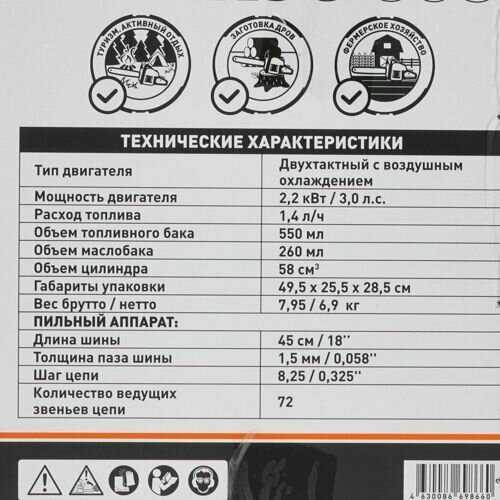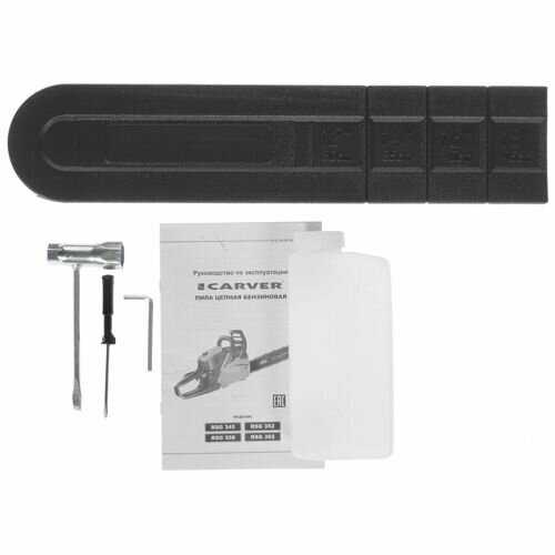 Комплект поставки : | бензопила, цепь, шина, чехол для шины, емкость для топливной смеси, ключ-отвертка, отвертка для регулировки карбюратора, ключ шестигранный, упор зубчатый с крепежом, инструкция по эксплуатации |